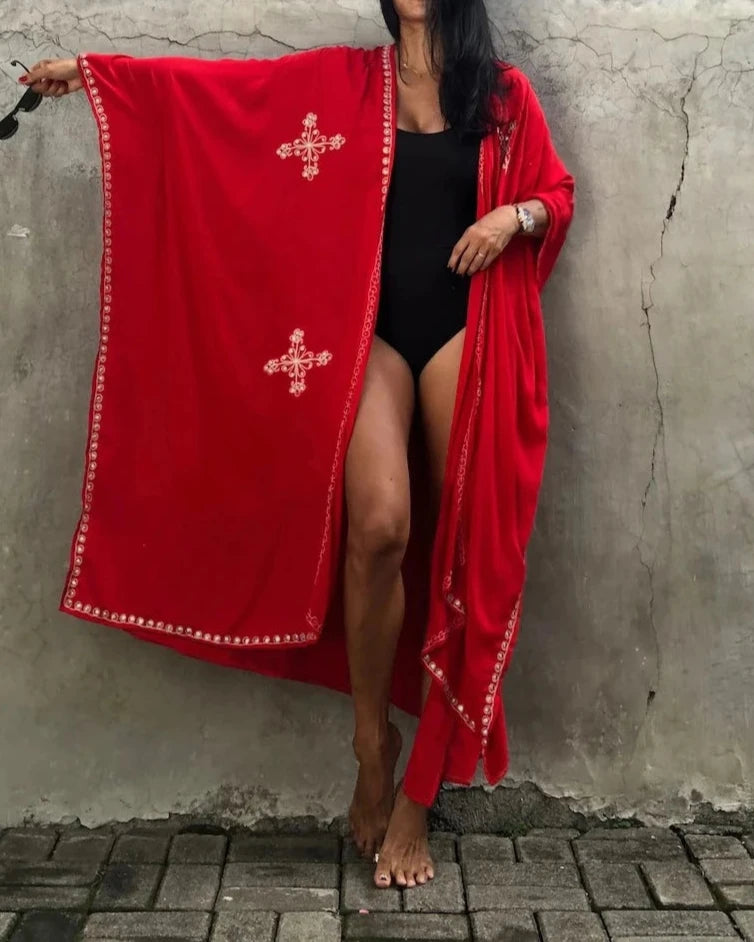 Introducing the Eira Kimono, the perfect addition to your summer wardrobe. This lightweight kimono features beautiful embroidery, adding a touch of elegance to any outfit. Stay cool and stylish in the Eira Kimono, a must-have for any fashion-forward woman.